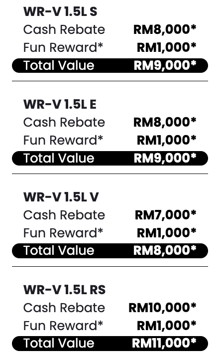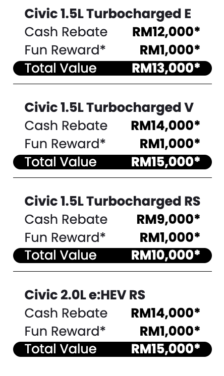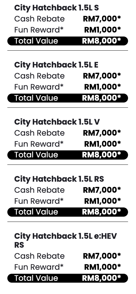 Looking for a new Honda? Claim cash rebates for up to RM10,000* and many more exciting promotions waiting for you. Additional RM1,500 if any of your family members are currently using a Honda. WhatsApp for more info!